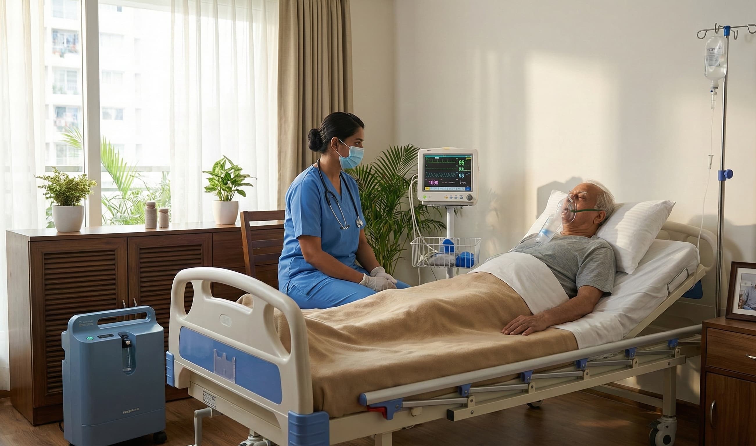 Complete ICU setup at home with ventilator support, oxygen therapy and 24/7 critical care nursing for serious patients in Ahmedabad.